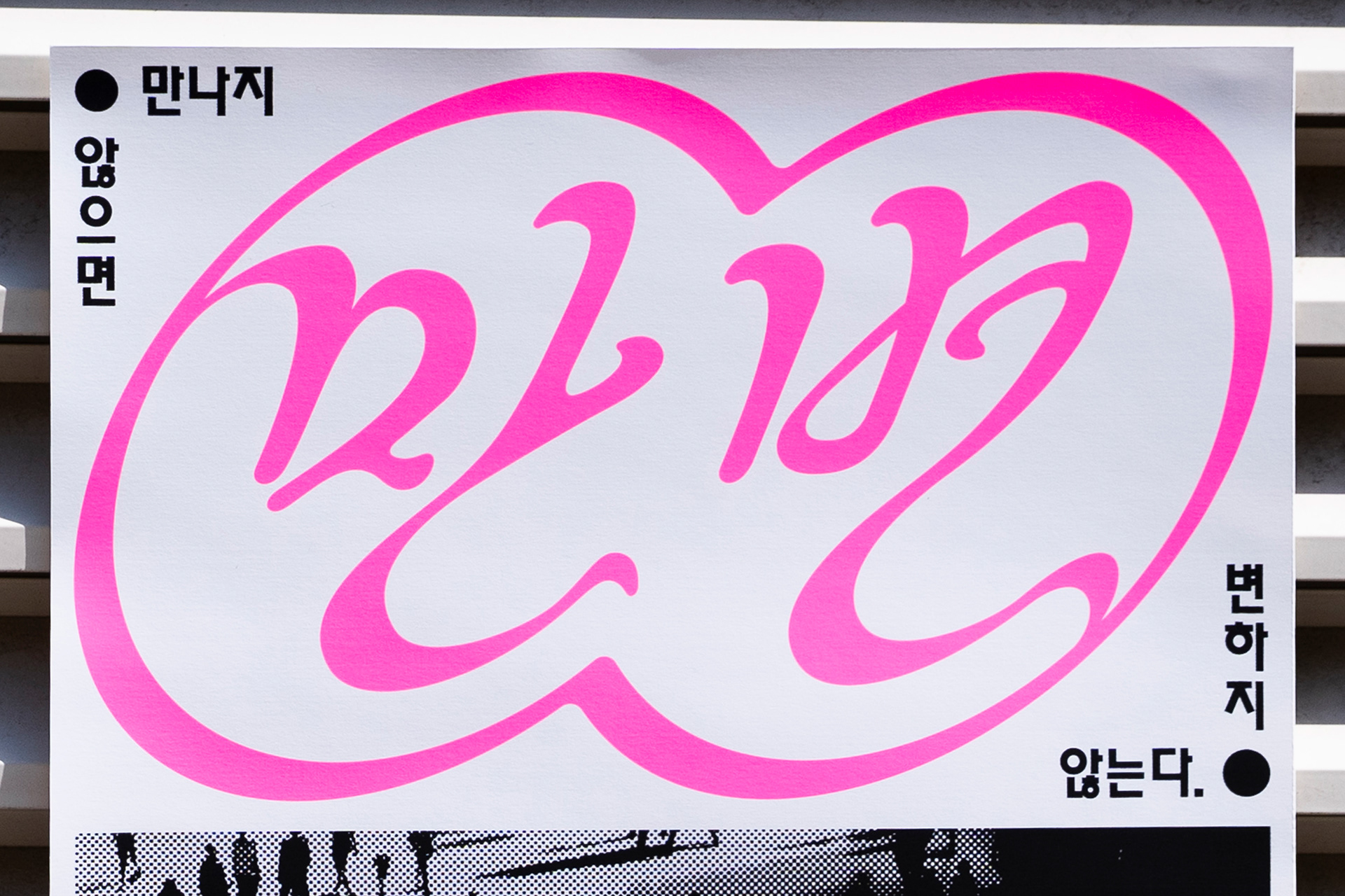 한글 줄임말인 ‘만변’을 기반으로 직접 레터링을 제작하였으며, 그 형태를 감싸는 유기적인 그래픽을 통해 서로 다른 사람들이 연결되고 조화되는 흐름을 시각화하고자 하였습니다. 레터링 자체에도 이러한 흐름감을 담아 관계와 융화의 인상을 전달하고자 하였습니다.