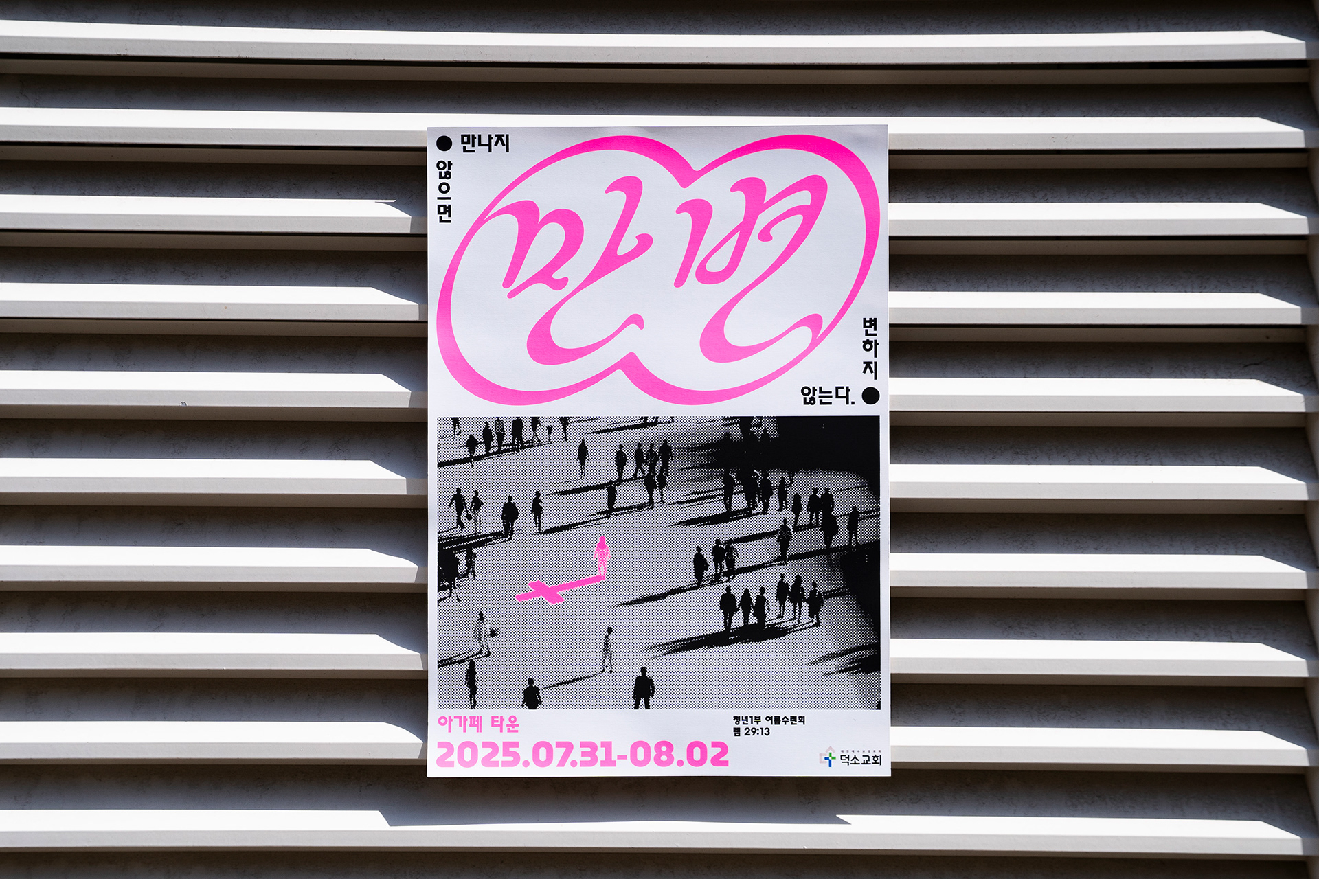 ‘만변’은 “만나지 않으면 변하지 않는다”는 메시지를 담아, 덕소교회 청년1부 여름 수련회를 위해 기획된 이벤트 아이덴티티입니다. 종교적 접점을 지닌 사람들의 내면 변화를 색상의 채도로 시각화하고, 다양한 개인들이 하나로 어우러지는 구조로 구성하였습니다.