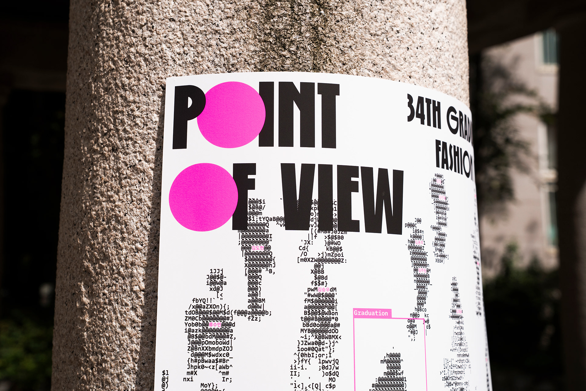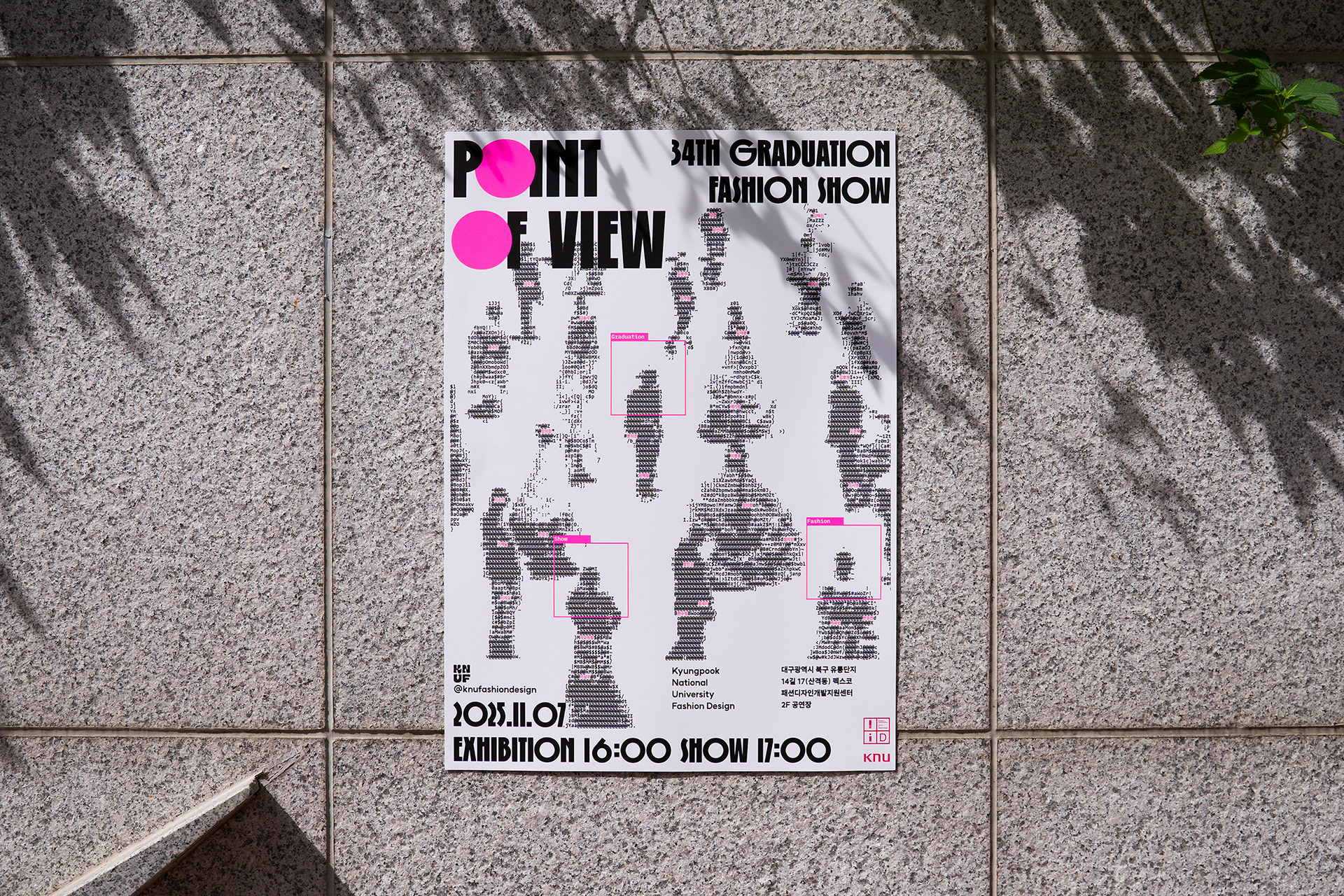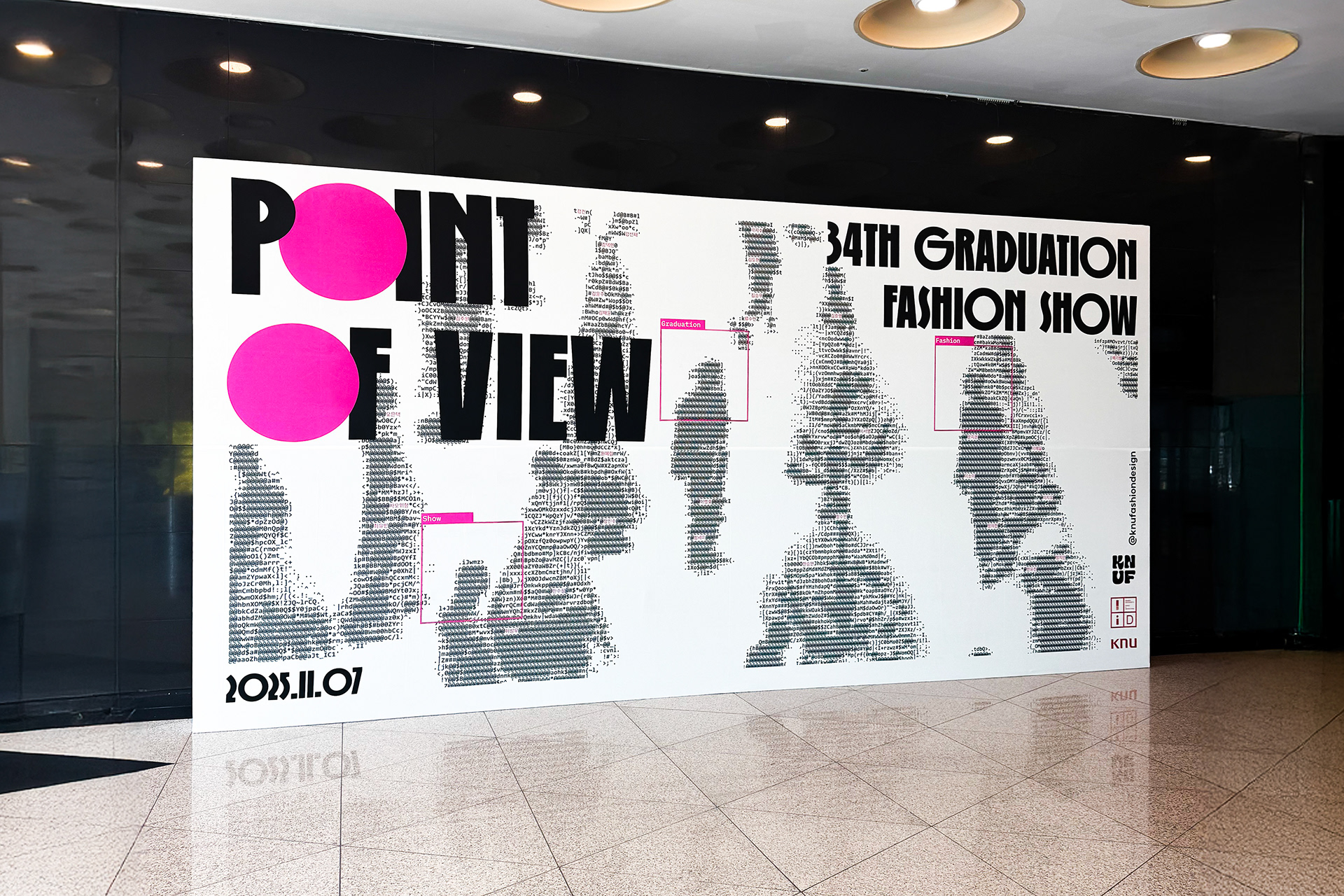 31인의 학생 디자이너의 개성과 그들만의 패션이라는 언어를 표현하고자 아스키 아트 방식을 사용했고, 시선이 닿는 Point를 강조하고자 형광 핑크 색상을 선택했습니다.