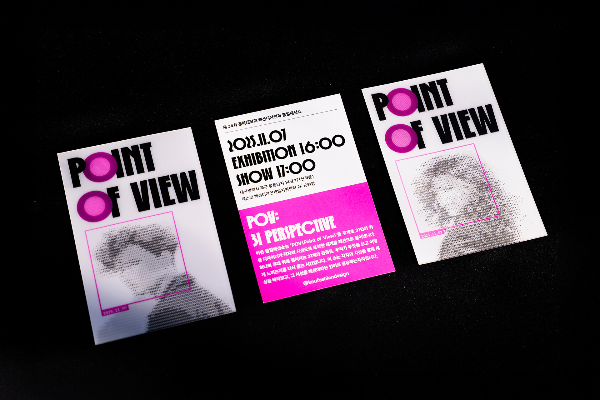 이번 졸업패션쇼는 ‘POV(Point of View)’를 주제로, 31인의 학생 디자이너가 각자의 시선으로 포착한 세계를 패션으로 풀어냅니다. 하나의 무대 위에 펼쳐지는 31개의 관점은, 우리가 무엇을 보고 어떻게 느끼는지를 다시 묻는 시간입니다.