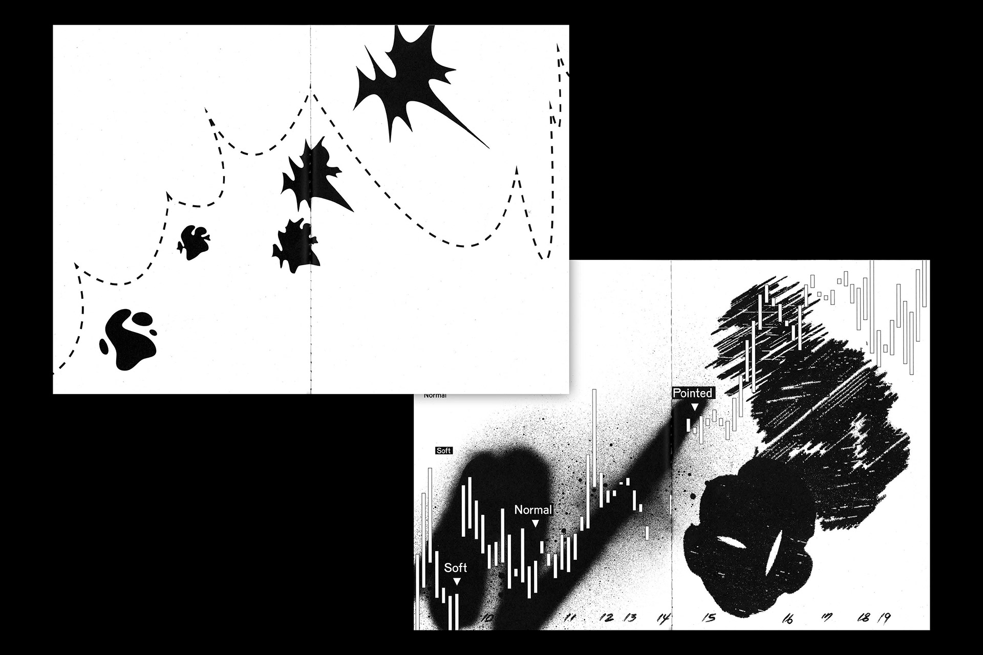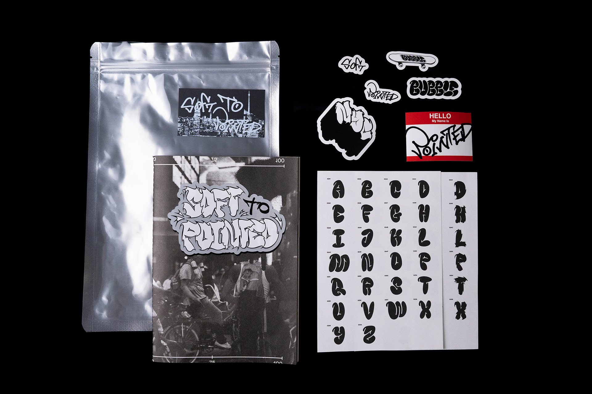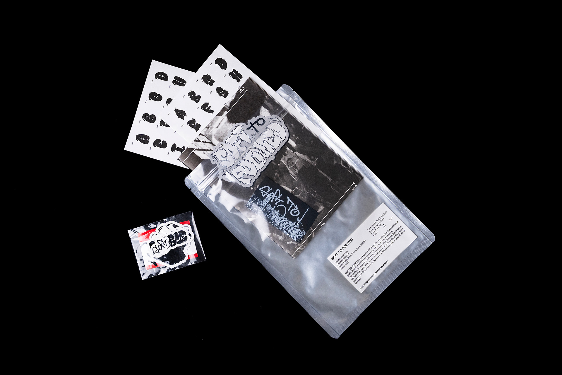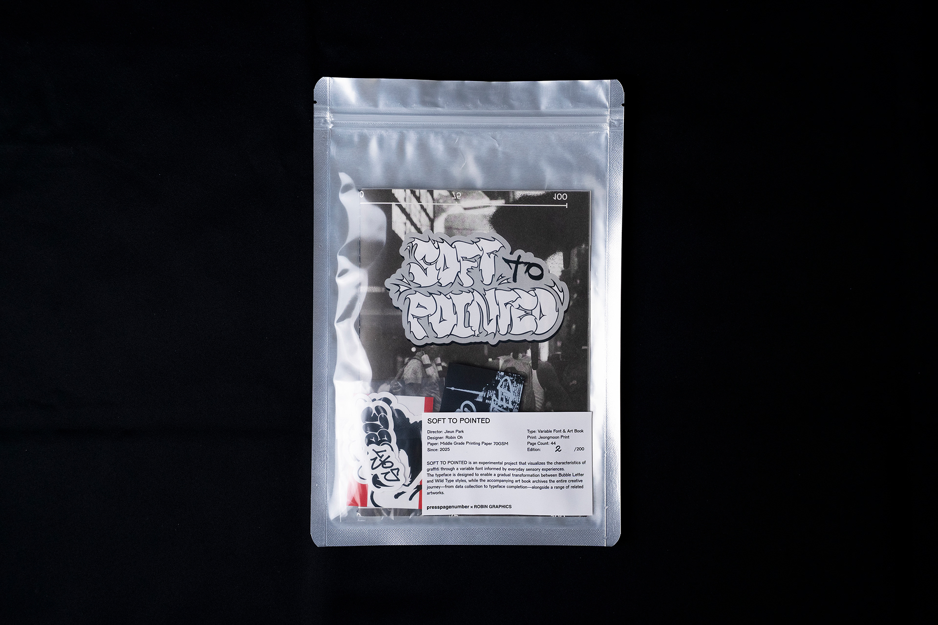 SOFT TO POINTED는 이러한 그래피티의 특징을 일상을 겪는 우리의 다양한 감각과 매칭한 시각 실험 결과물로, 가변 글꼴과 아트북으로 구성됩니다. 가변 글꼴은 우리의 일상 속 감각을 단계별로 가변치를 두어 그래피티의 두 가지 유형인 버블레터(Bubble Letter)가 와일드타입(Wild Type)으로 유연하게 변화되도록 제작했습다. 아트북은 데이터를 수집한 과정부터 글자 모양 스케치 등 글꼴을 완성하기까지 프로젝트의 모든 여정을 아카이브하고 가변 글꼴의 단계별 형태 변화, 글꼴을 활용한 아트워크 등을 수록했습니다.